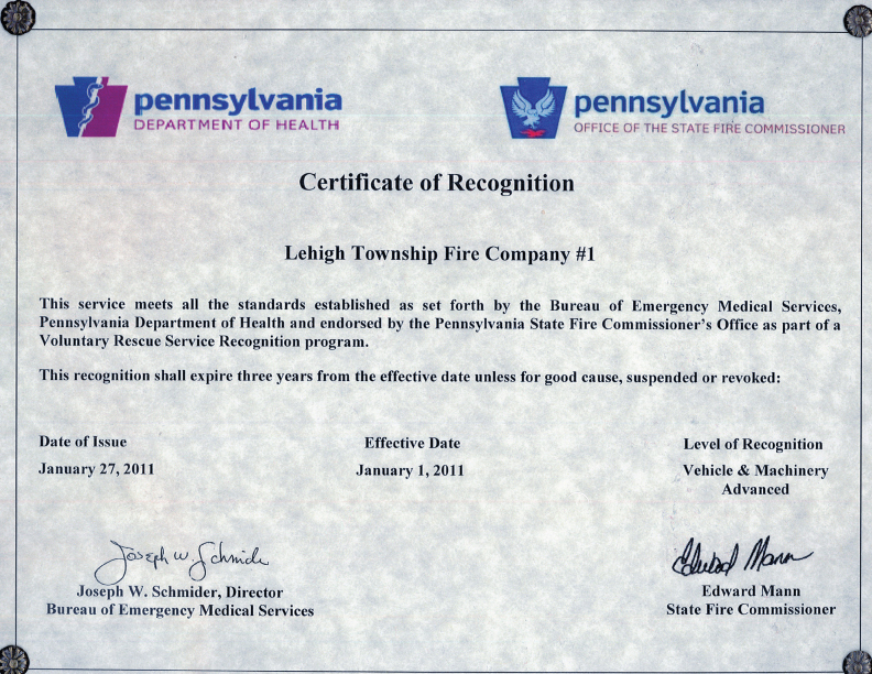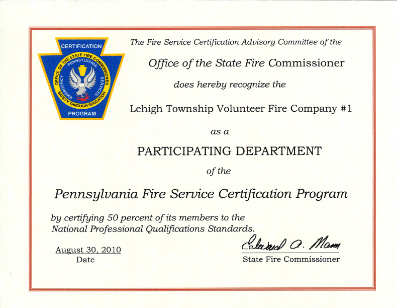 We, the undersigned citizens of the Township of Lehigh, County of Northampton, State of Pennsylvania, are convinced of the necessity of establishing an institution for the safety and welfare of our fellow citizens, and to enlarge our social relations to be derived from a well-regulated Fire Company. The object and purpose of this Company shall be that of extinguishing fire, the furtherance of fire prevention, the rendering of first-aid to the sick and injured, and to cooperate with other agencies in time of need, rendering whatever aid is deemed necessary to alleviate the suffering of our fellow citizens.